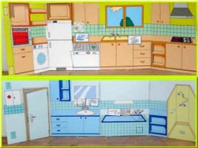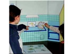 La maison mini, représentation sur panneaux réversibles d'une cuisine et d'une alle de bains, avec 55 vignettes autocollantes représentant des objets usuels de leur vie quotidienne, avec les actions de comportement, les dangers, les actions d’alertes et premiers secours.